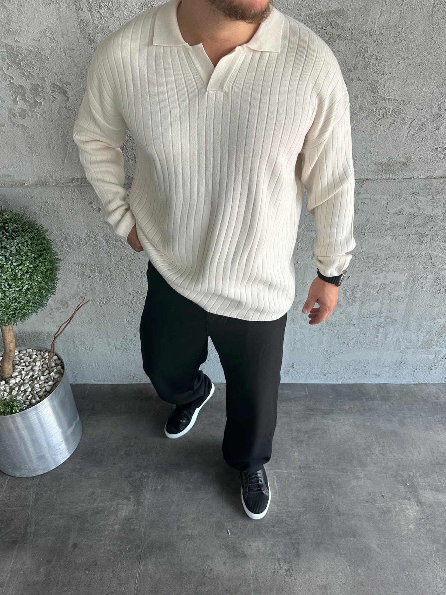 Ekru Polo Yaka Fitilli Triko Kazak