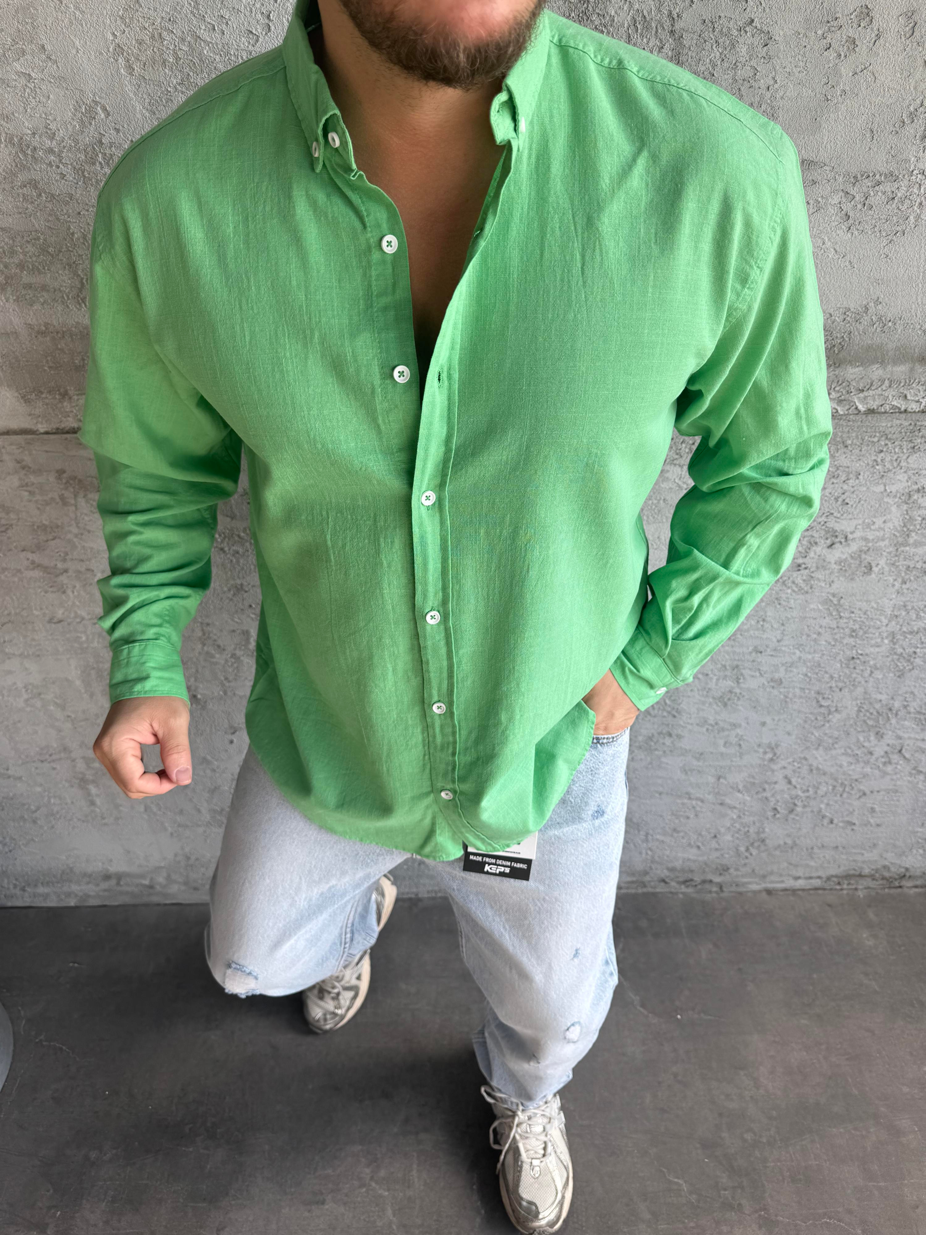 Yeşil Fresh Keten Basic Gömlek