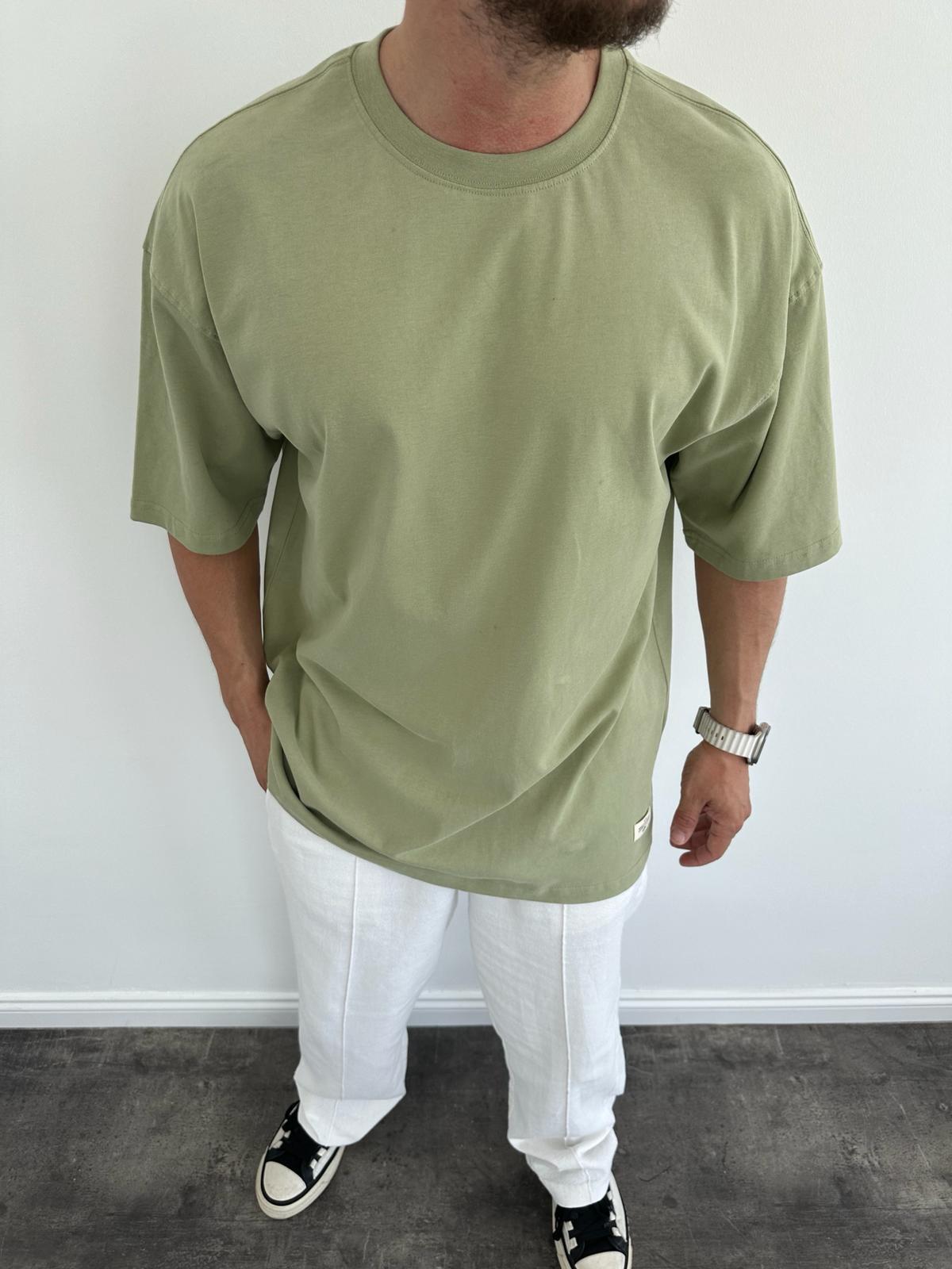 Haki Yeşil Fırçalı Kumaş Oversize T-Shirt