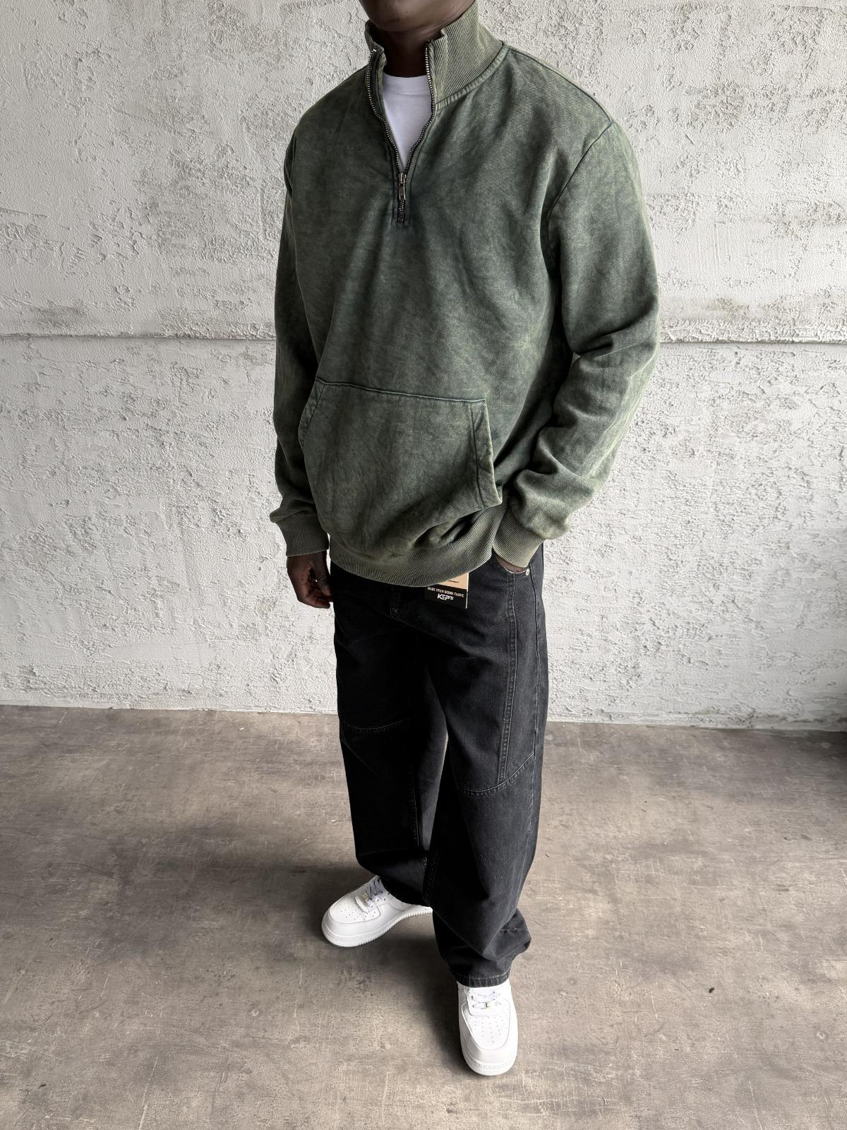 Haki Yıkamalı Fermuarlı Sweatshirt