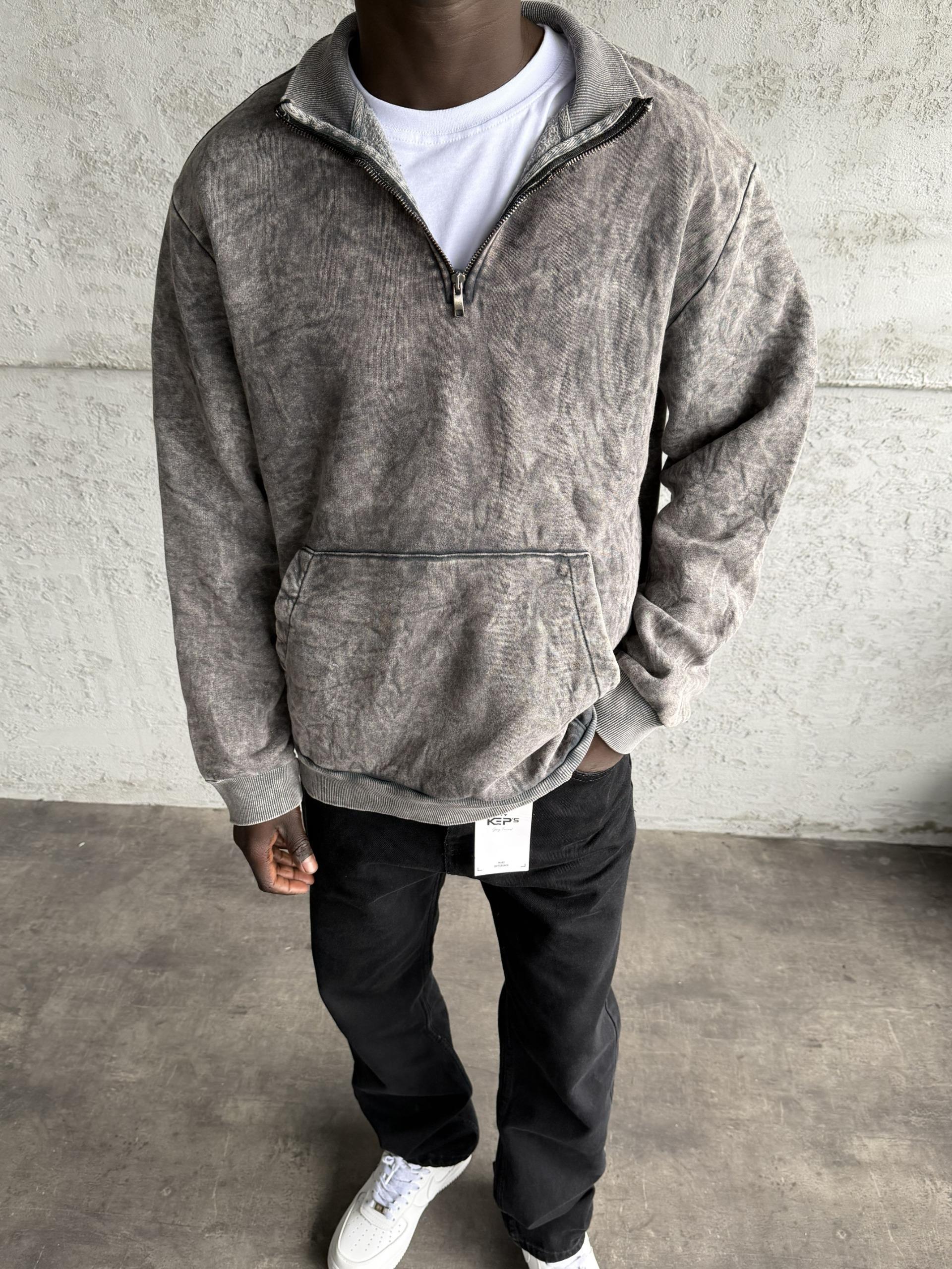 Koyu Gri Yıkamalı Fermuarlı Sweatshirt