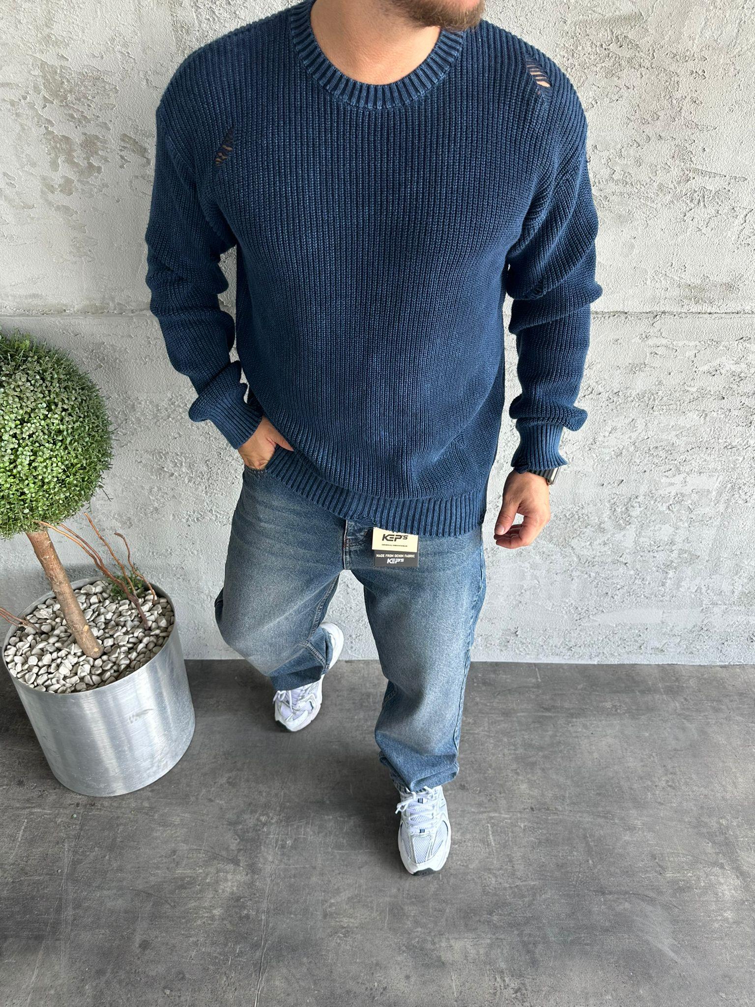 Lacivert Yıkamalı Yırtık Detaylı Kazak