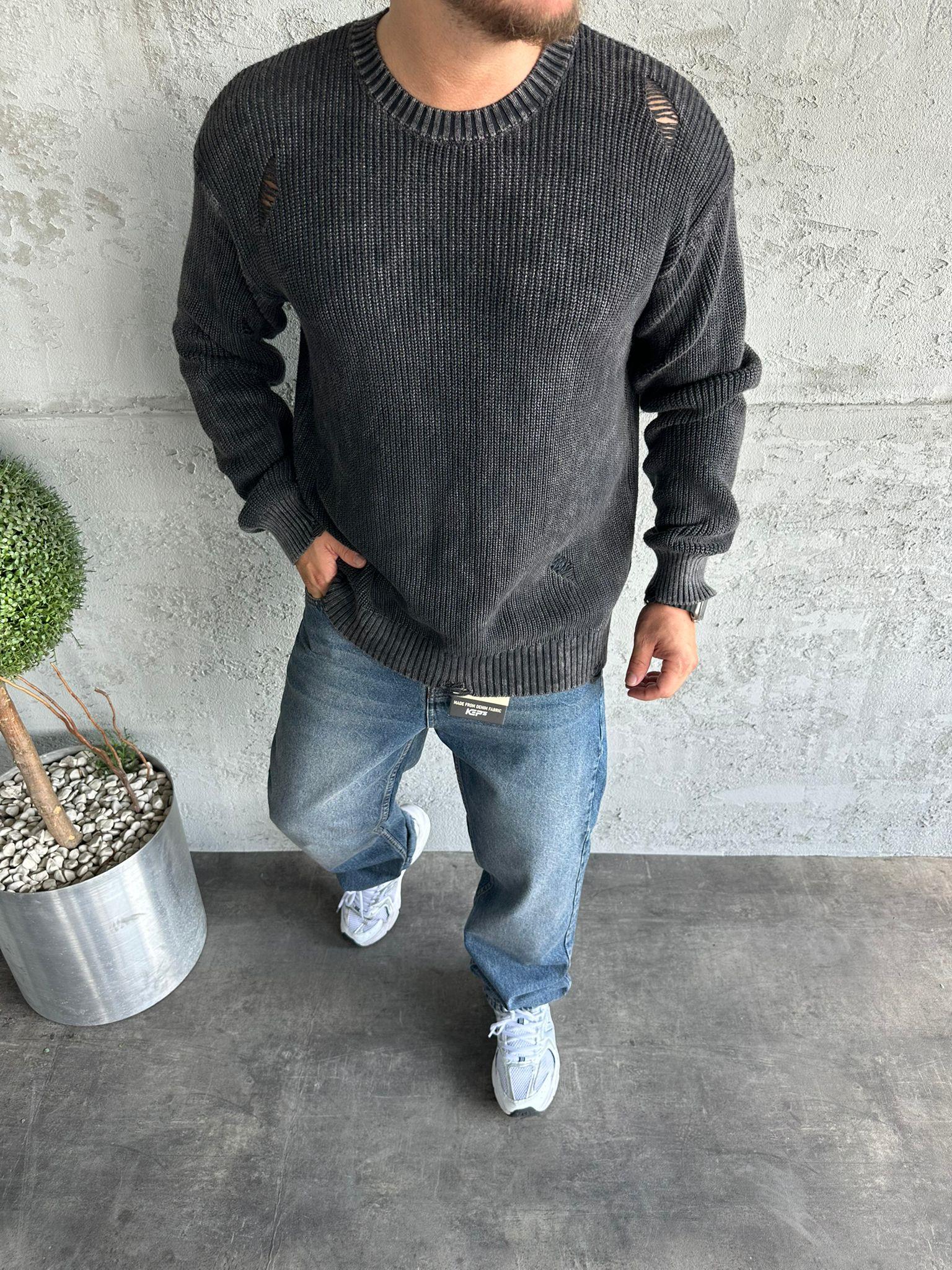 Siyah Yıkamalı Yırtık Detaylı Kazak